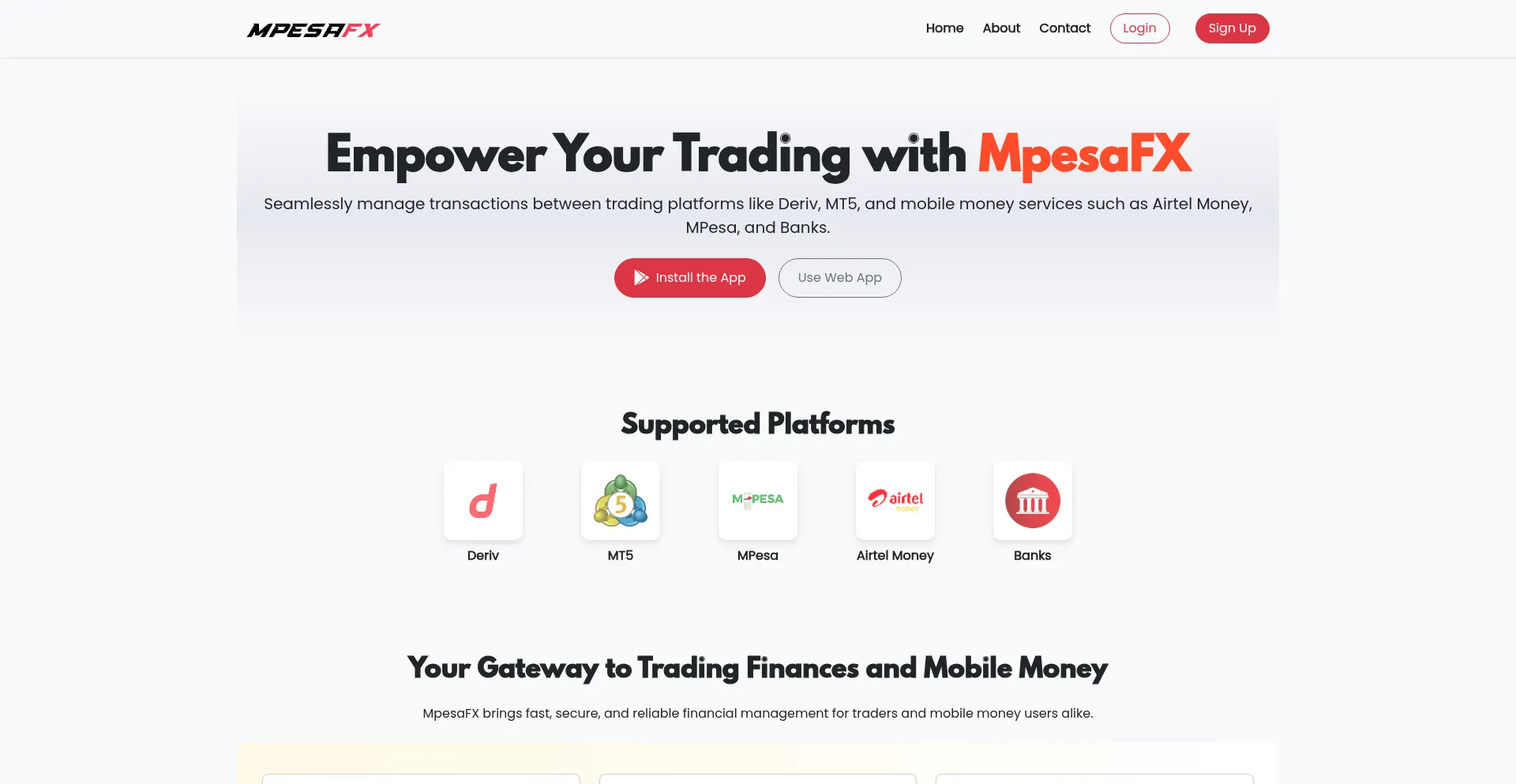 The mpesafx.com website offers a mobile application for Android devices, indicating expanded platform presence beyond web-based services.