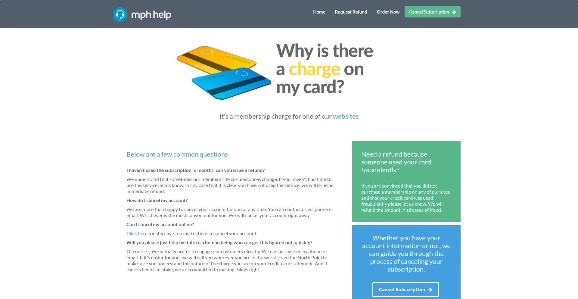 The website contains dedicated sections addressing payment disputes, subscription management, chargeback procedures, refund policies, and other financial transaction concerns, indicating established billing operations.