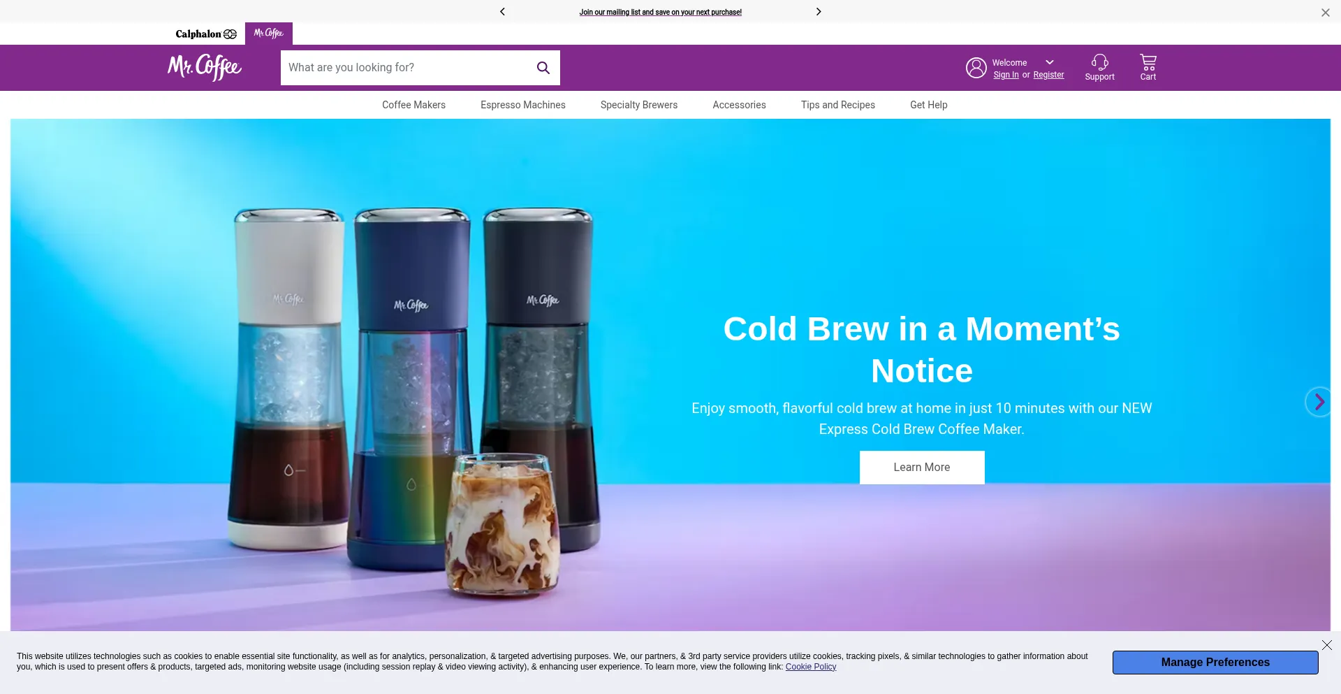 The website implements cookie consent mechanisms in compliance with privacy regulations such as GDPR or CCPA. This demonstrates that mrcoffee.com adheres to data protection standards and provides users with control over personal data collection practices.