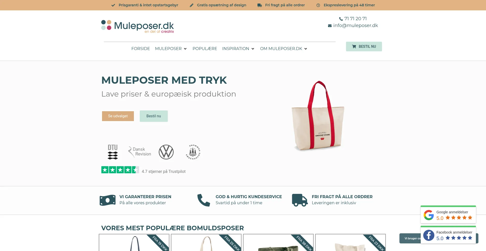 Vi forhandler muleposer med tryk til virksomheder. Hvad enten du ønsker muleposer i bomuld, jute, eller plastik er vi her til at hjælpe.