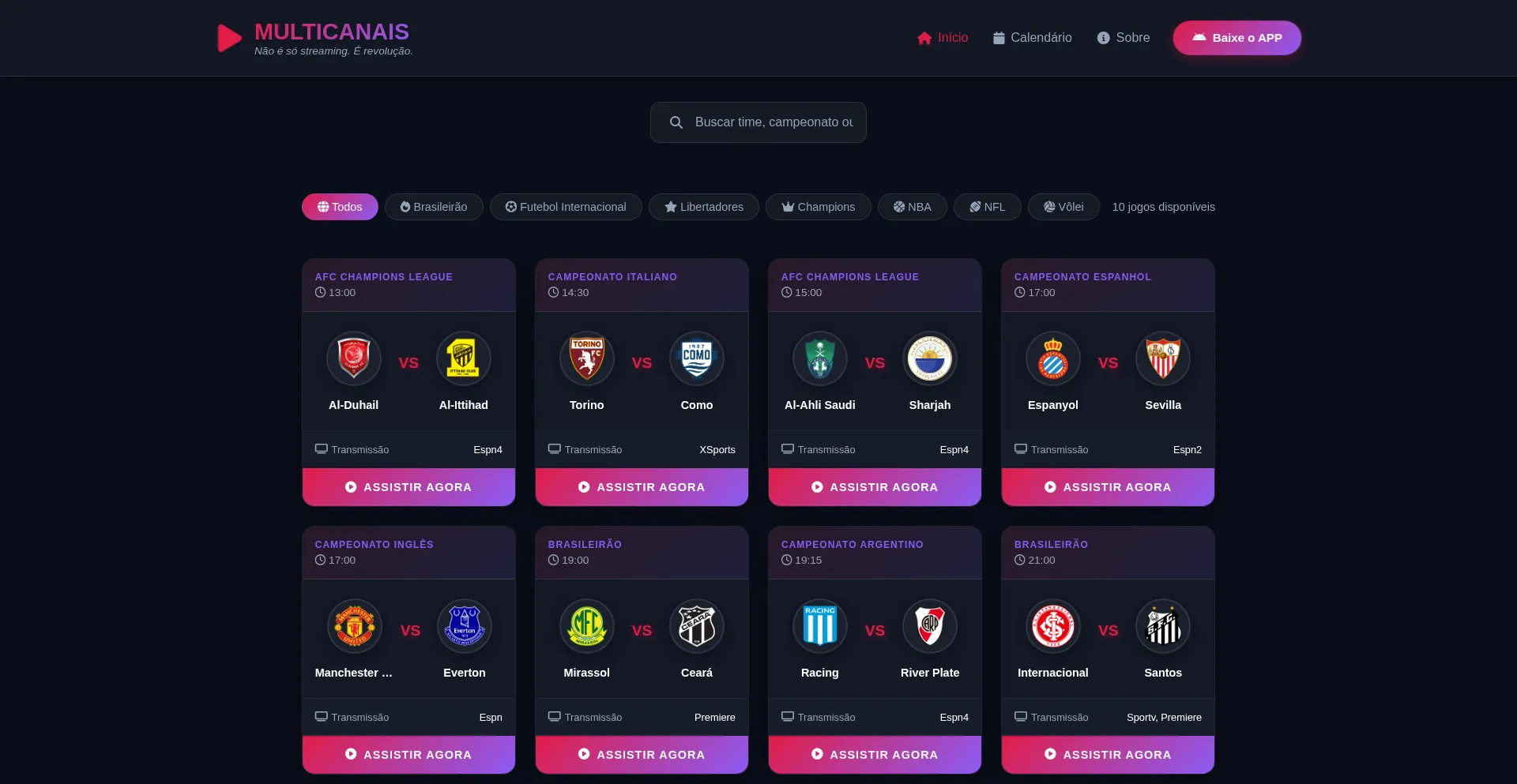 Assista jogos ao vivo no multicanais. Futebol, vôlei, basquete e as melhores ligas esportivas do mundo. Brasileirão, Libertadores, Champions League, NBA, NFL, MMA, Futebol, Go...