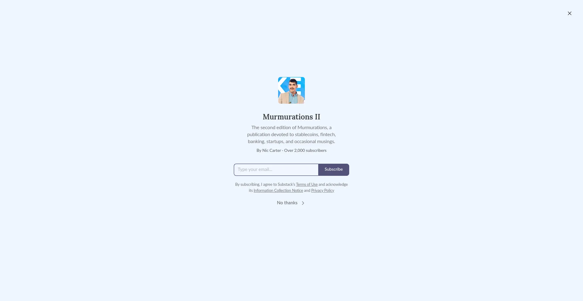 The second edition of Murmurations, a publication devoted to stablecoins, fintech, banking, startups, and occasional musings. Click to read Murmurations II, by Nic Carter, a Sub...