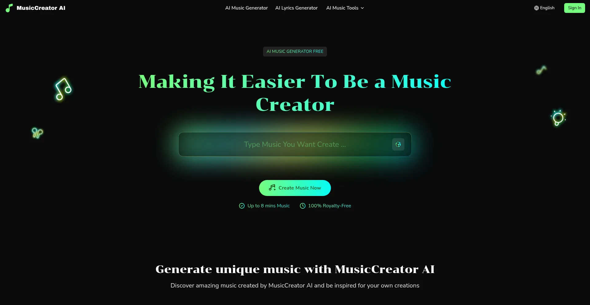 Create unlimited royalty-free music with MusicCreator AI. Generate unique songs in seconds using AI technology. Perfect for videos, podcasts, and projects. Try free now!