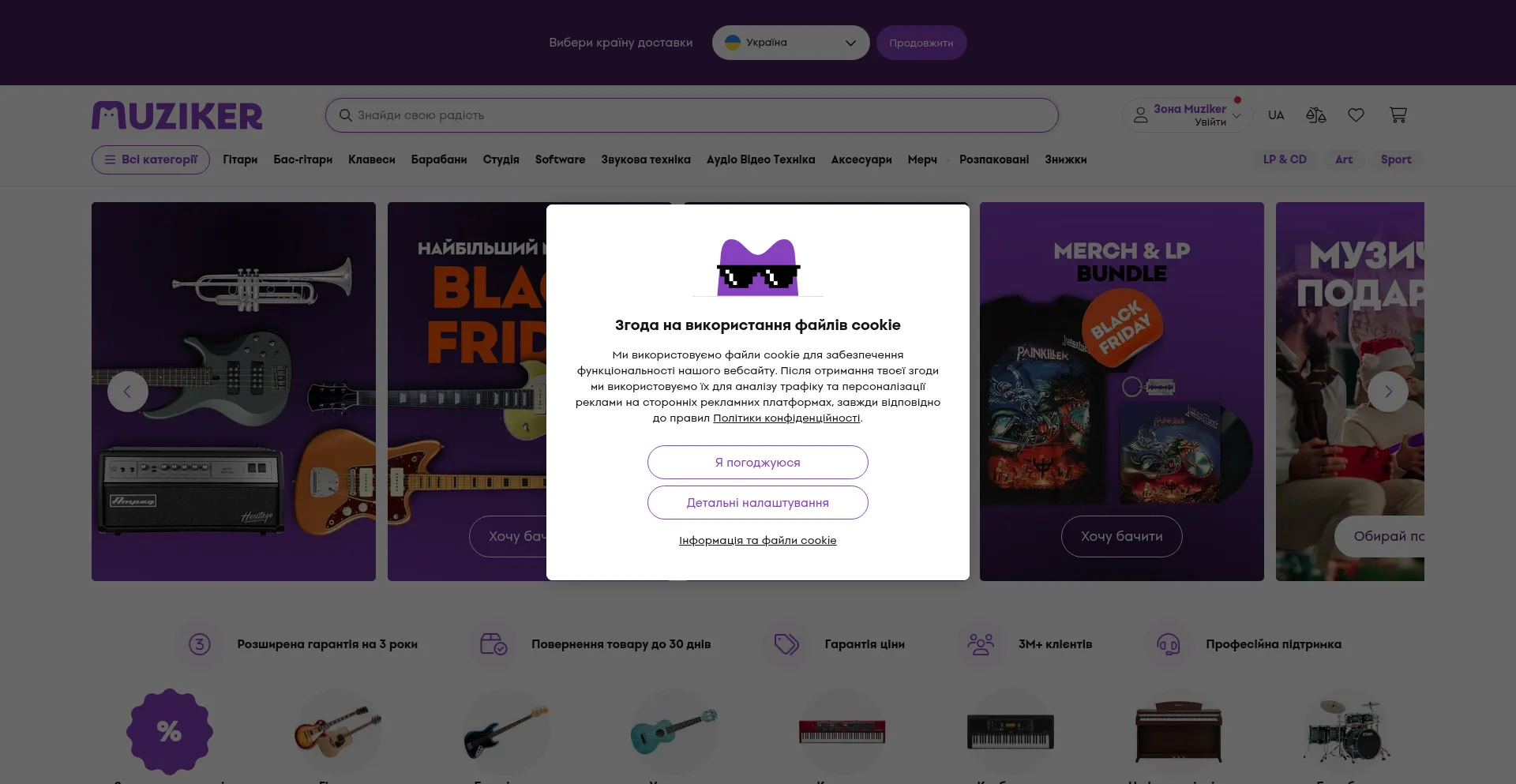 Analysis indicates that muziker.ua operates as an e-commerce platform facilitating online transactions for goods or services. The website implements shopping cart functionality, payment processing systems, and product catalog features typical of commercial retail operations.