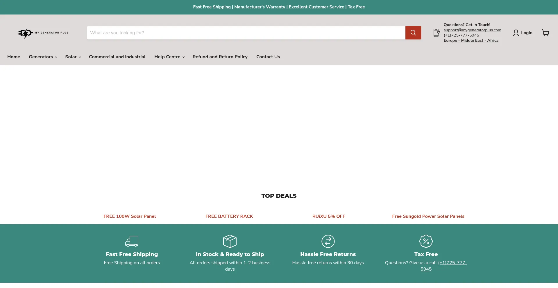 The mygeneratorplus.com website utilizes free e-commerce platform solutions, which may indicate cost-conscious operations but could also suggest limitations in security features, customer support, or advanced functionality compared to enterprise-grade solutions.