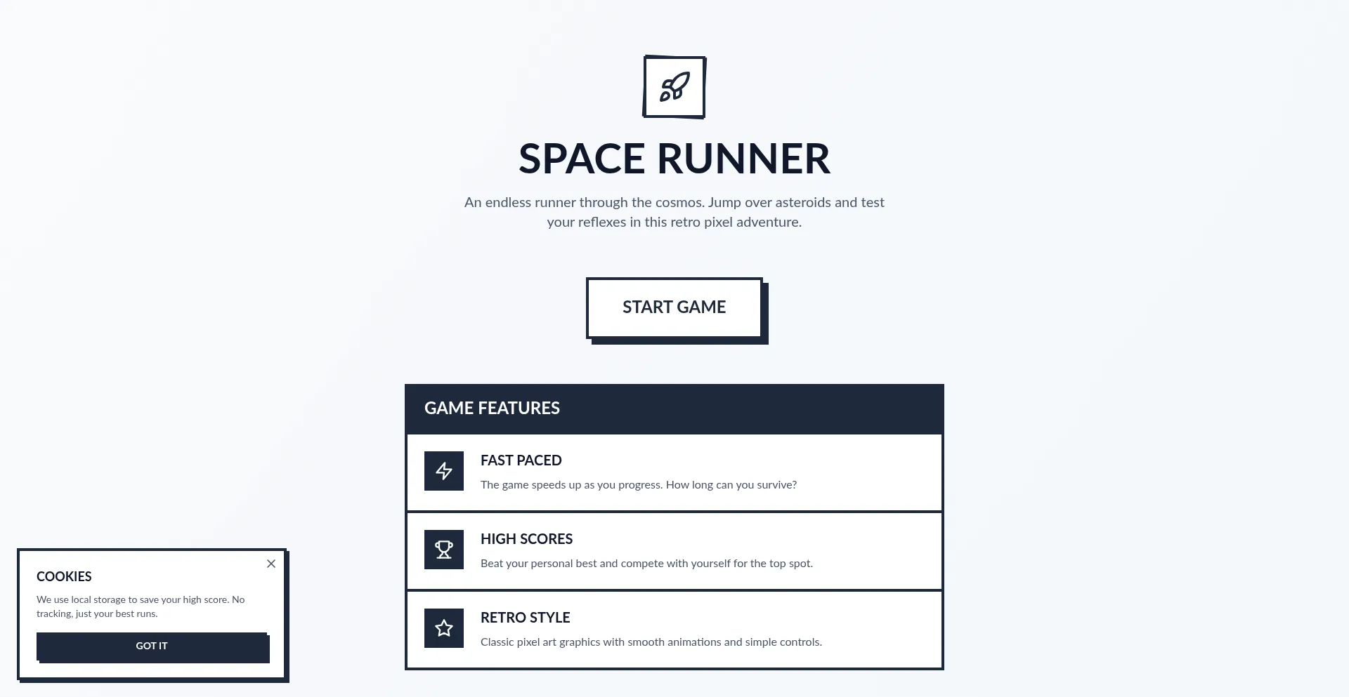 Space Runner is a fast-paced endless runner game set in space. Jump over asteroids, test your reflexes, and compete for high scores in this retro pixel adventure. Play free in y...