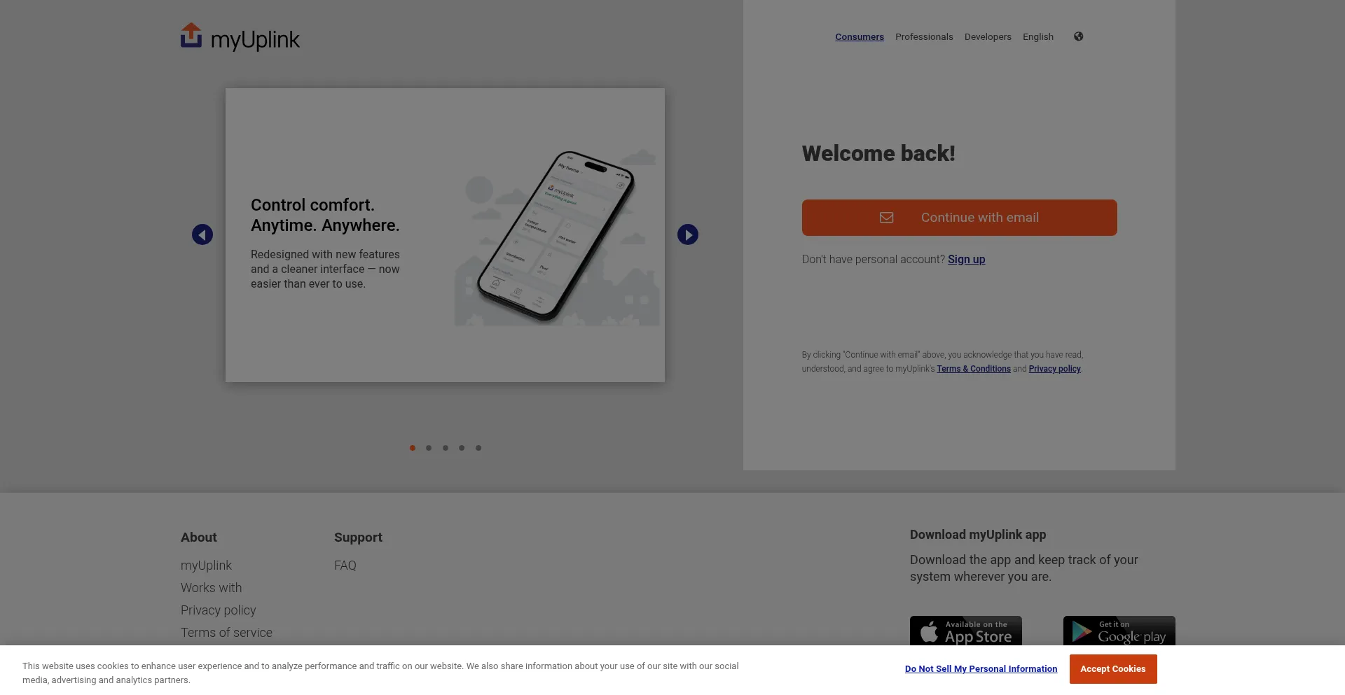 The website implements cookie consent mechanisms in compliance with privacy regulations such as GDPR or CCPA. This demonstrates that myuplink.com adheres to data protection standards and provides users with control over personal data collection practices.