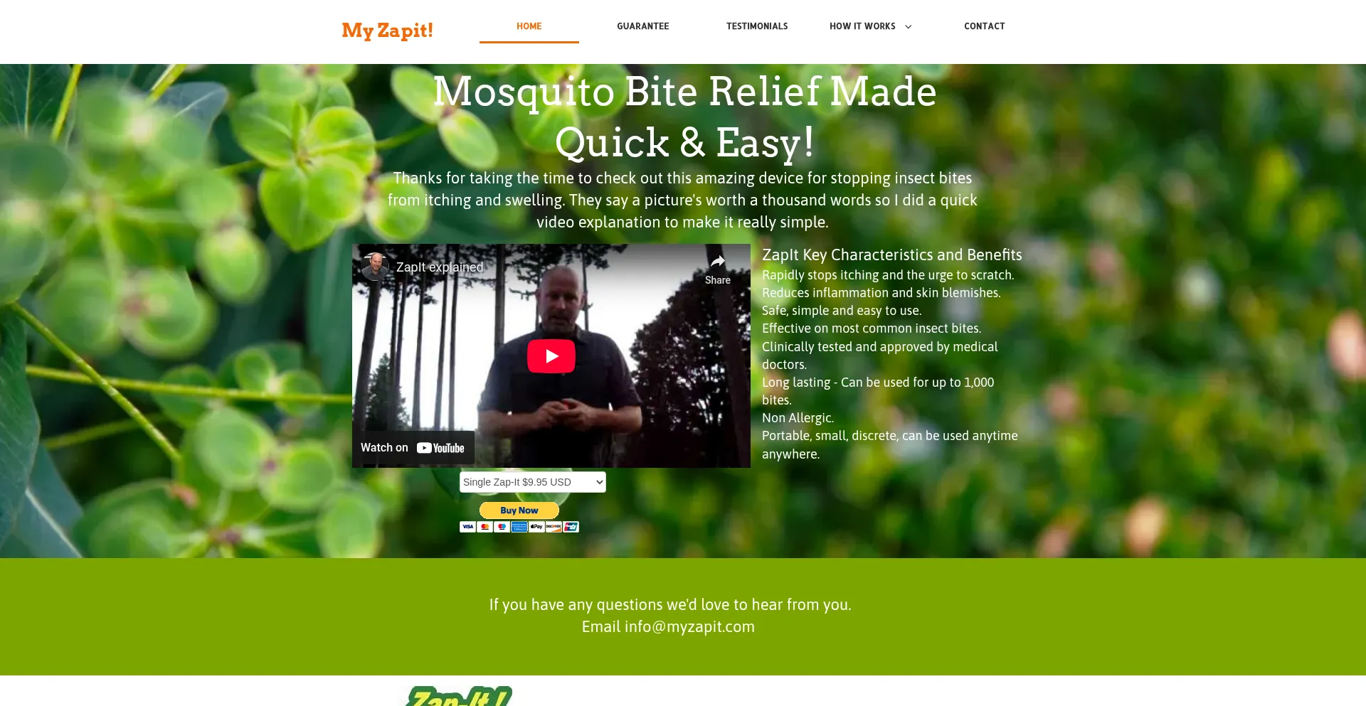 ZapIt is a small piezo electric device proven in clinical studies to stop the itch and swelling of mosquito and other insect bites. It does so by inte