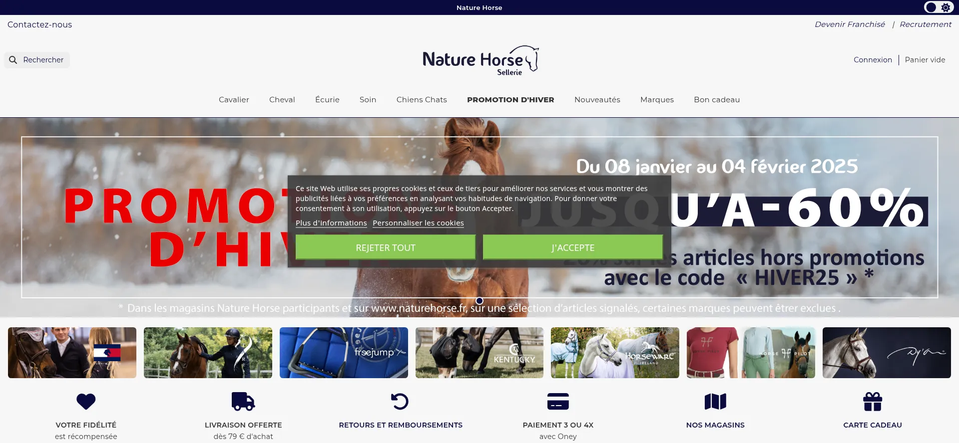 Analysis indicates that naturehorse.fr operates as an e-commerce platform facilitating online transactions for goods or services. The website implements shopping cart functionality, payment processing systems, and product catalog features typical of commercial retail operations.