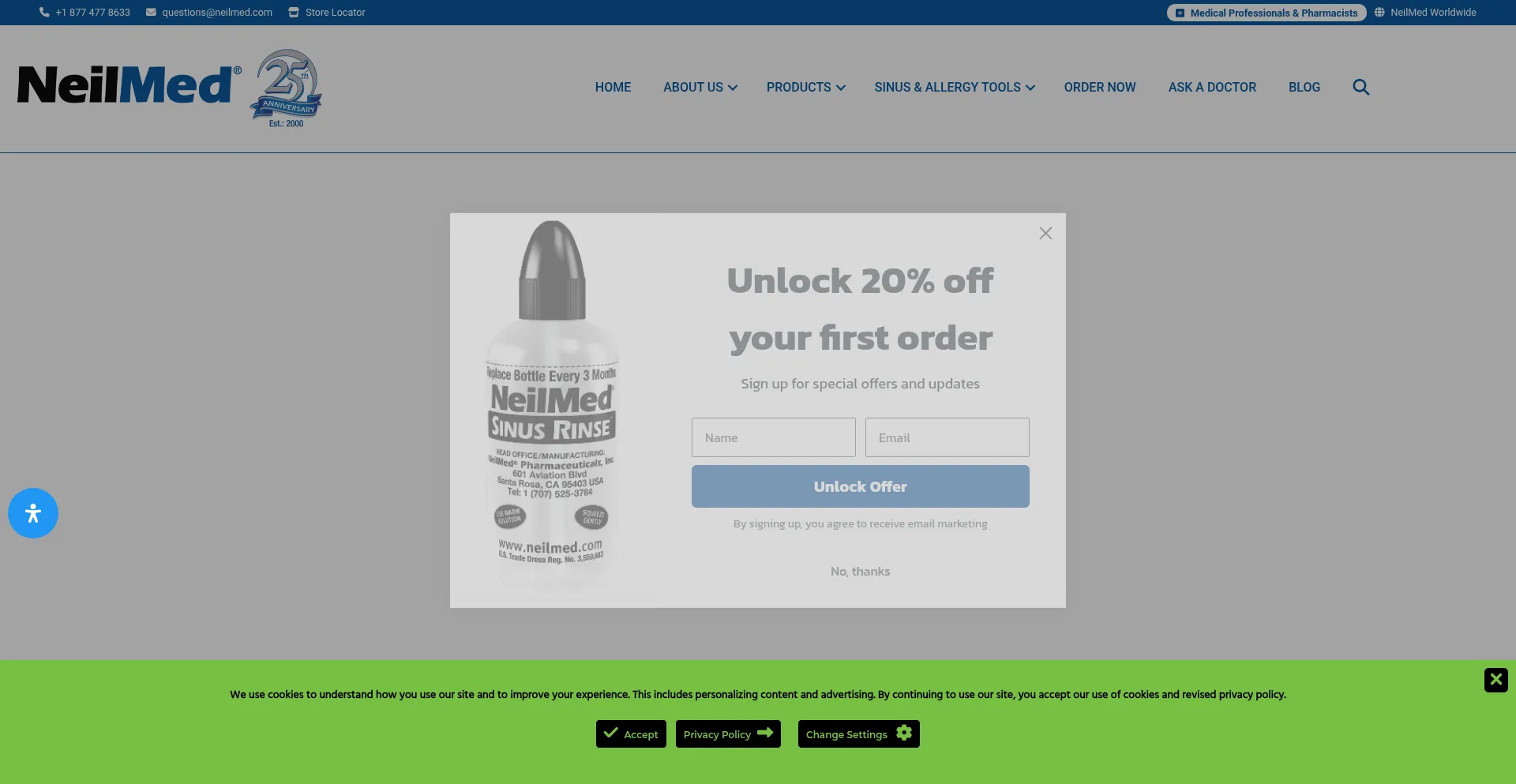 The website implements cookie consent mechanisms in compliance with privacy regulations such as GDPR or CCPA. This demonstrates that neilmed.com adheres to data protection standards and provides users with control over personal data collection practices.
