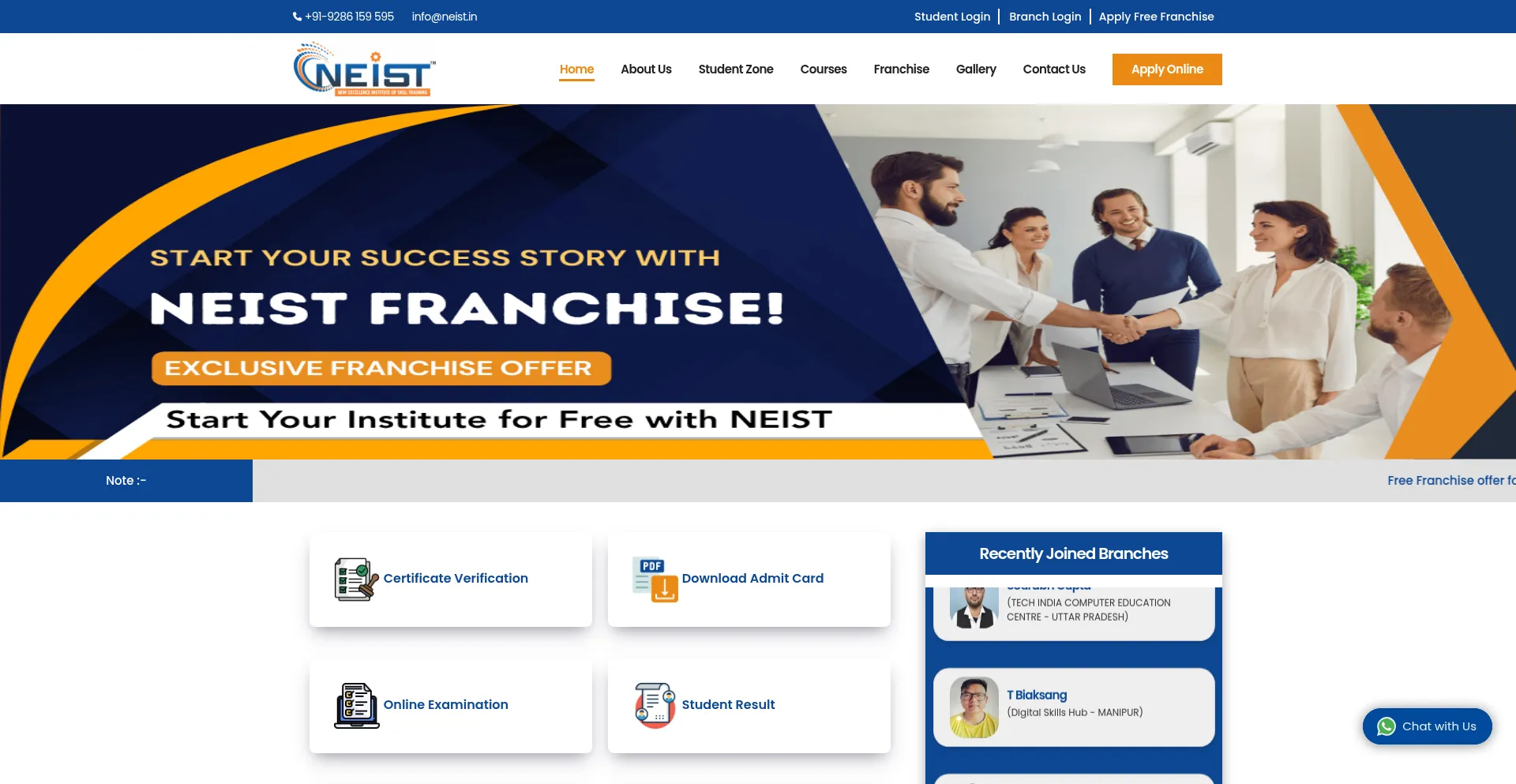 Start your own computer center in any Indian state with NEIST's 100% free franchise. Easy registration, lifetime support & student dashboard included.
