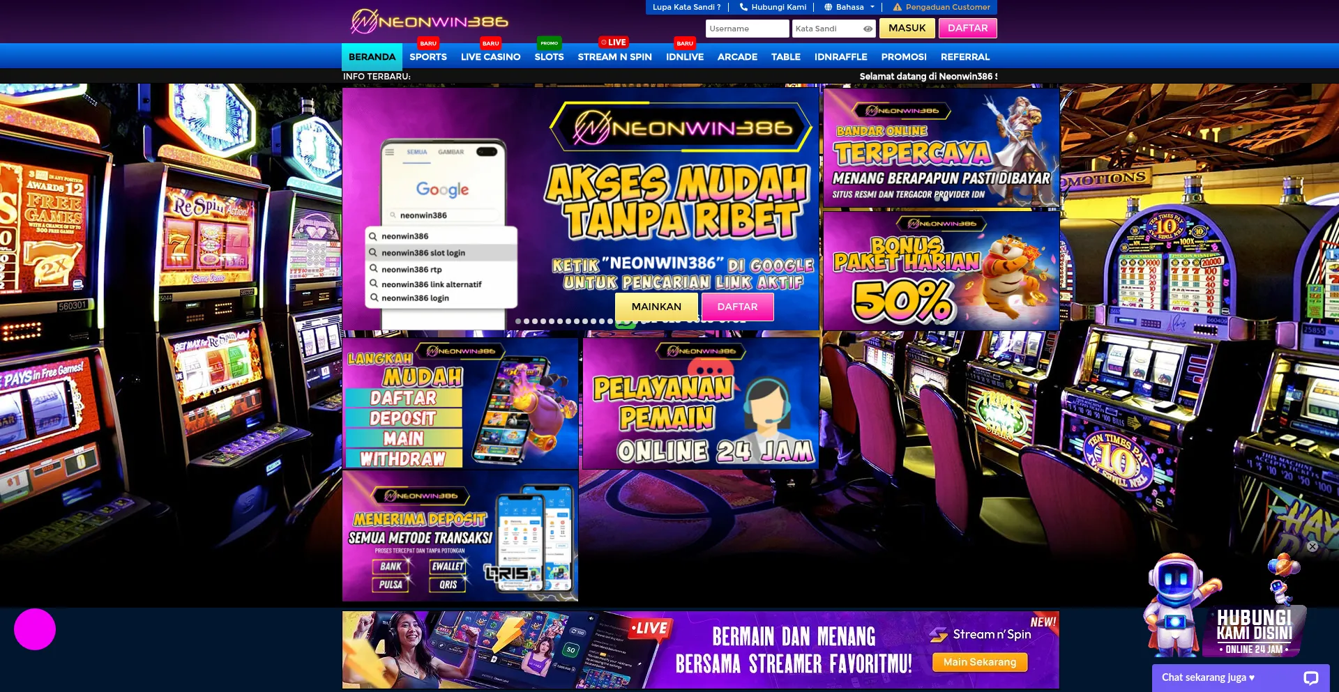 NEONWIN386 salah satu Situs Game Online Agen Taruhan Permainan Lengkap di Indonesia yang menyediakan taruhan Bola, Game Gacor, Live Dealer, Poker dan Lotery.