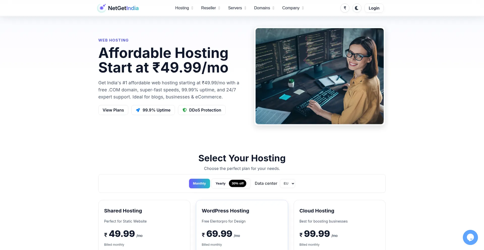 Web Hosting India at ₹49.99/mo | Free .COM & SSL – NetGetIndia