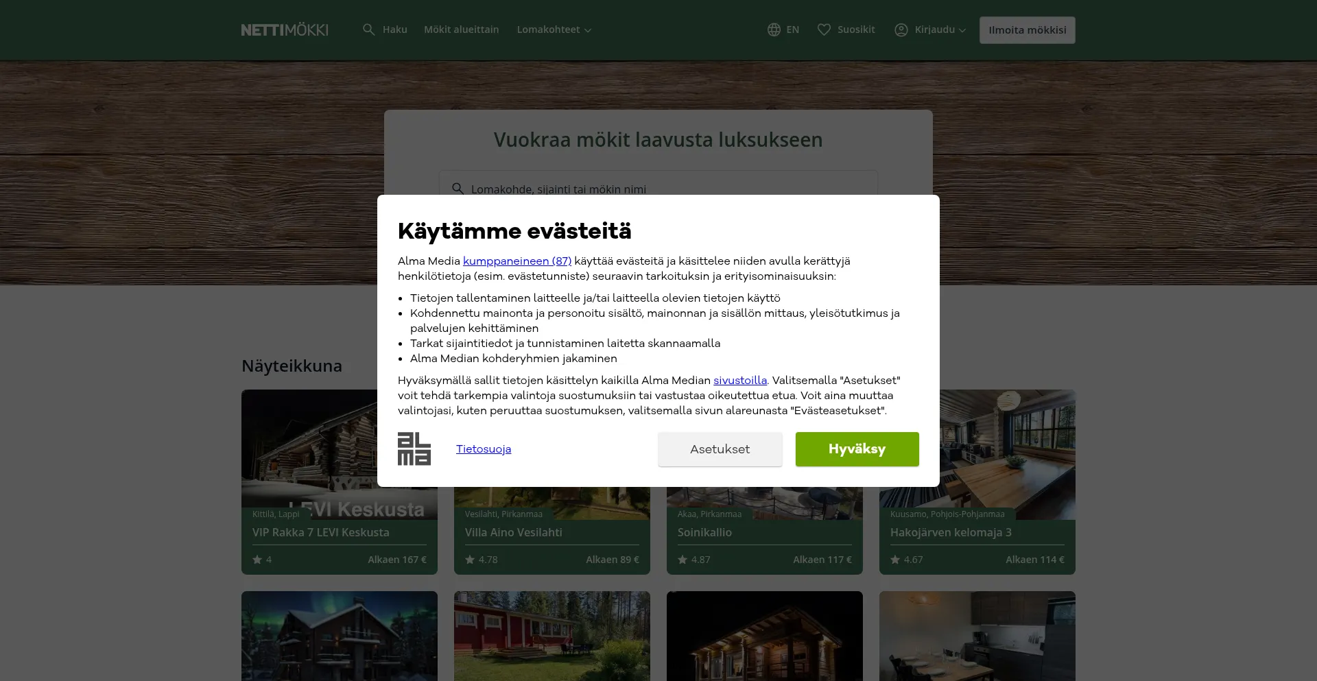 cdn.almamedia.fi nettimokki.com www.nettimokki.com gto.nettimokki.com cdn.privacy-mgmt.com static.zdassets.com www.almamedia.fi www.googletagmanager.com pubads.g.doubleclick.net cdn.almamedia.tech +17 more