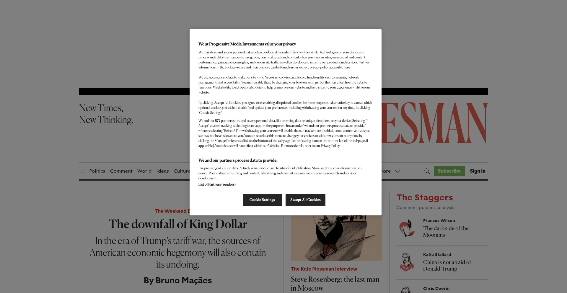 The website implements cookie consent mechanisms in compliance with privacy regulations such as GDPR or CCPA. This demonstrates that newstatesman.com adheres to data protection standards and provides users with control over personal data collection practices.