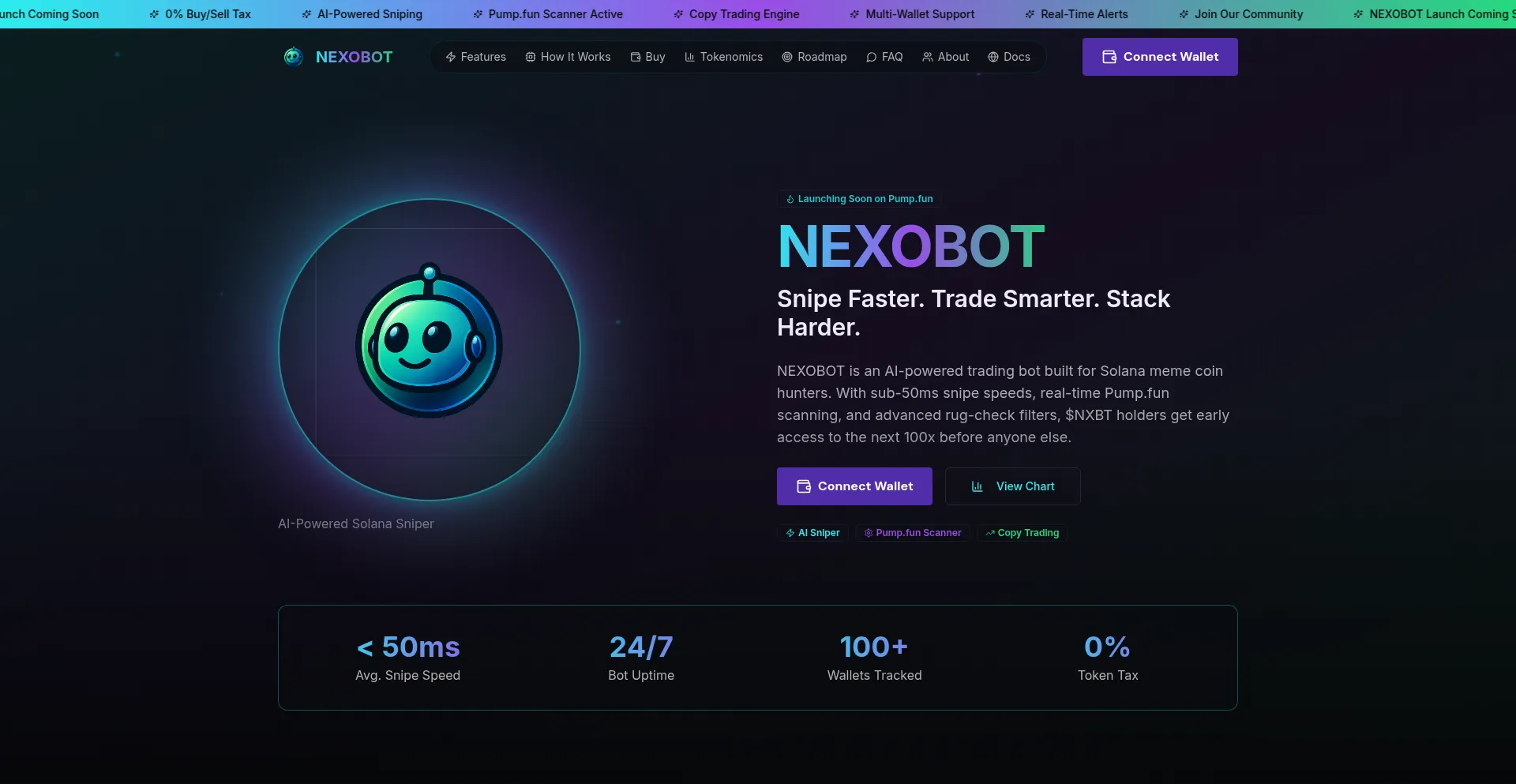 NEXOBOT ($NXBT) is an AI-powered Solana sniper bot and Pump.fun scanner. Auto-detect new tokens, check safety metrics, and execute lightning-fast trades. Join the revolution in ...