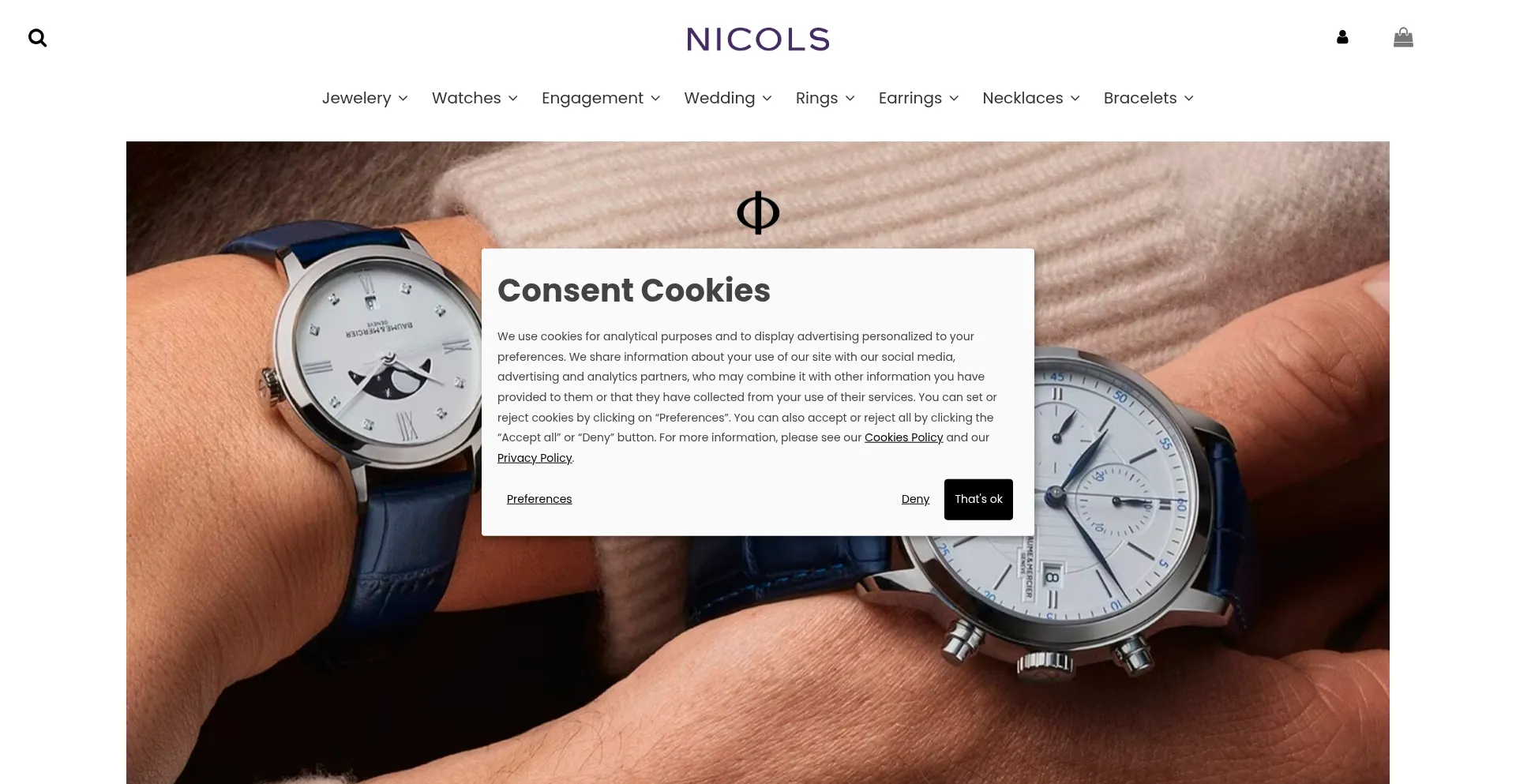 The website implements cookie consent mechanisms in compliance with privacy regulations such as GDPR or CCPA. This demonstrates that nicolsjewelry.com adheres to data protection standards and provides users with control over personal data collection practices.