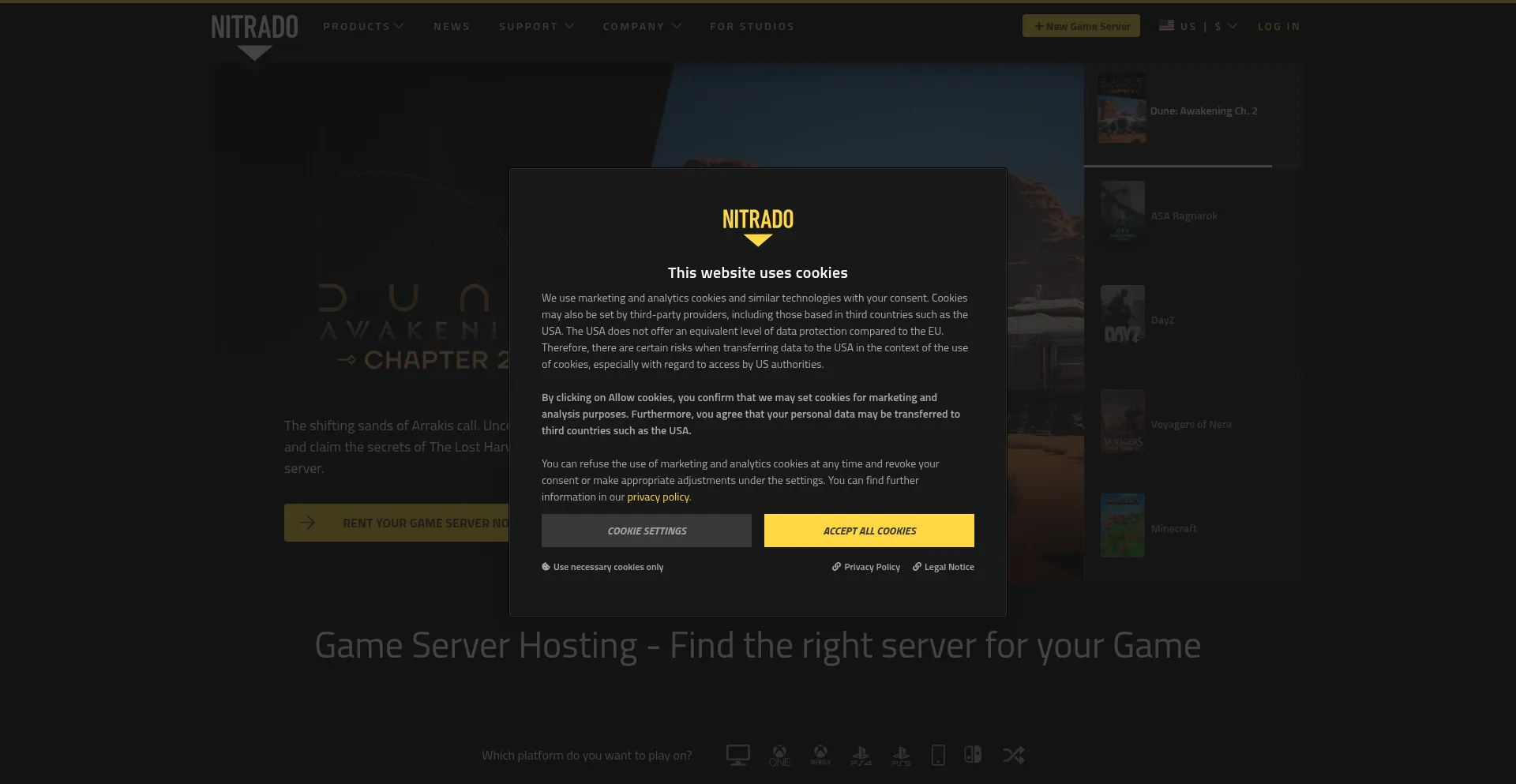 The website implements cookie consent mechanisms in compliance with privacy regulations such as GDPR or CCPA. This demonstrates that nitrado.net adheres to data protection standards and provides users with control over personal data collection practices.