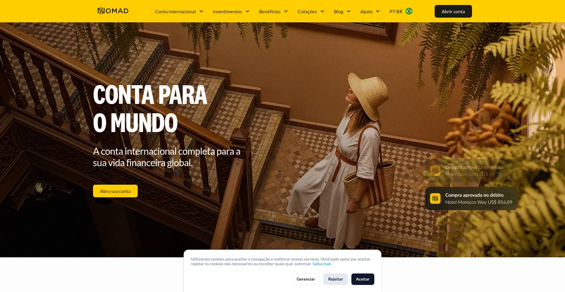 Com a Conta Internacional Nomad você tem um cartão aceito mundialmente, seguro viagem, internet, sala VIP exclusiva, investimentos em dólar e muito mais!