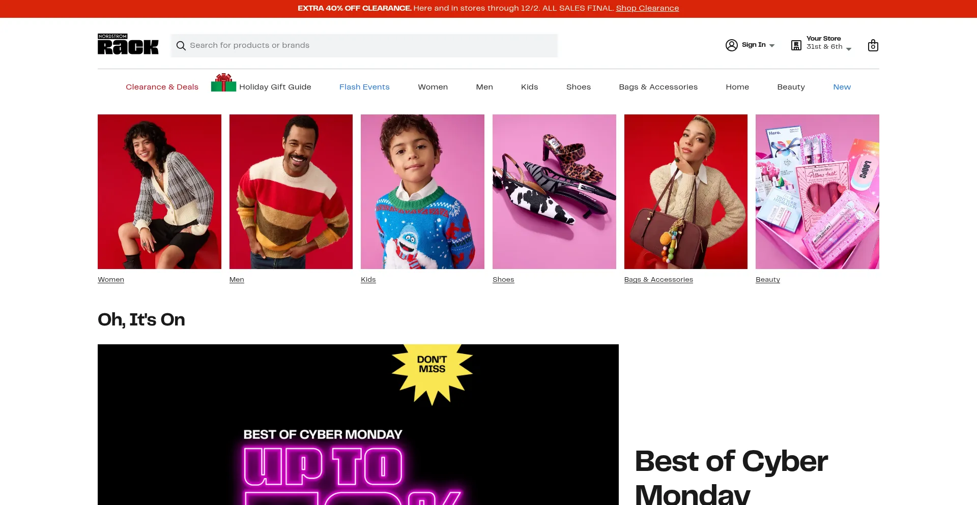 Analysis indicates that nordstromrack.com operates as an e-commerce platform facilitating online transactions for goods or services. The website implements shopping cart functionality, payment processing systems, and product catalog features typical of commercial retail operations.