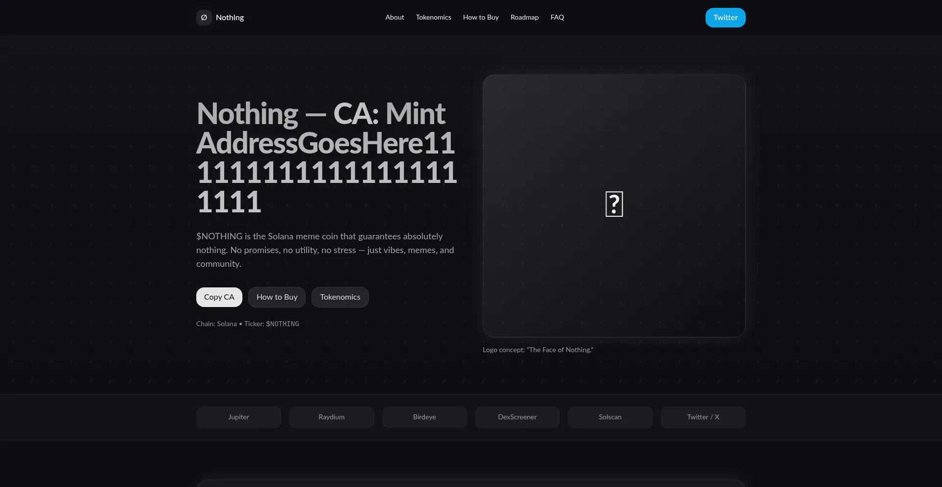 Nothing ($NOTHING) is the Solana meme coin that promises absolutely nothing — and delivers it in style. CA (mint) is shown right in the H1 for the degen speedrunners.
