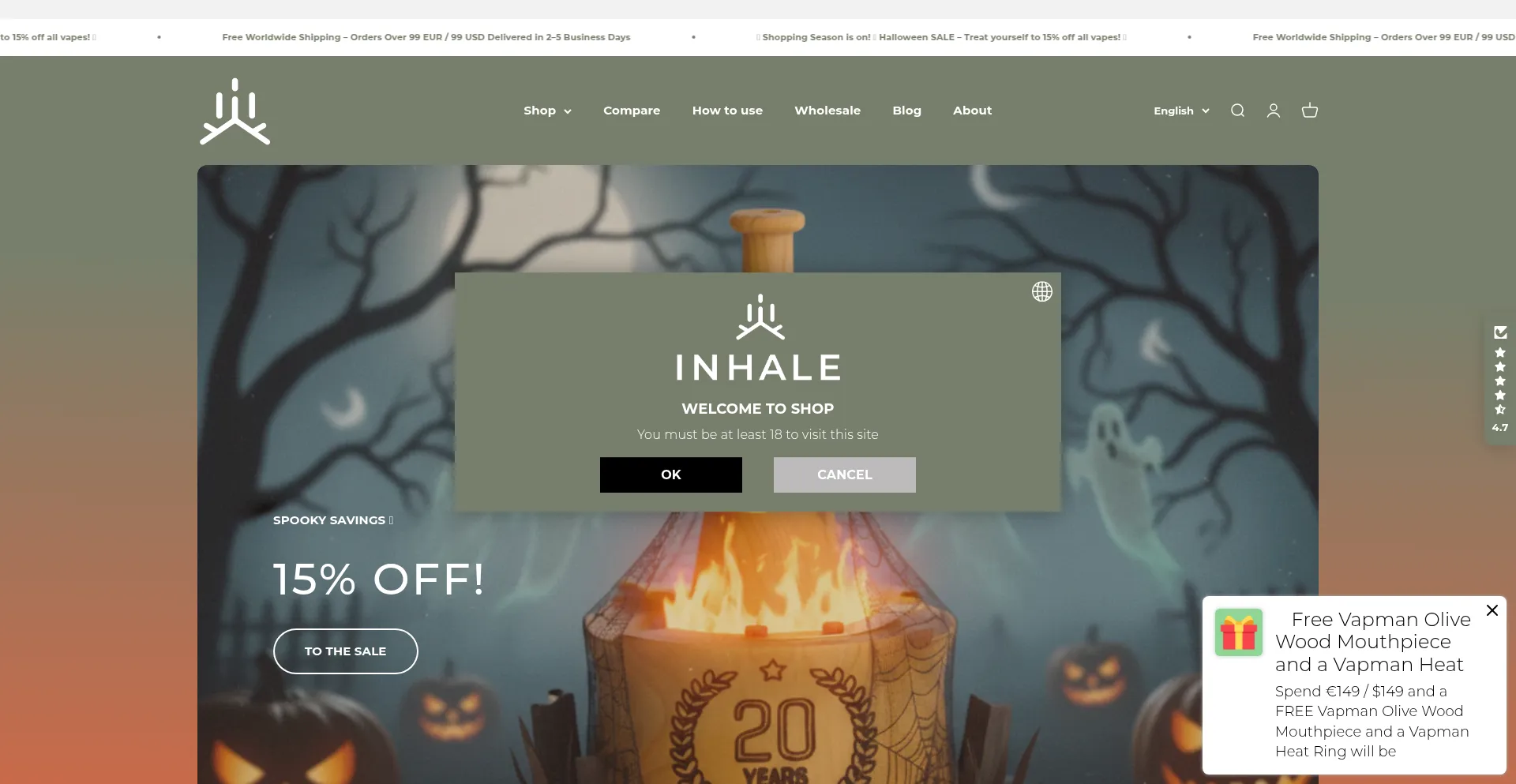 18+ Shopping Reliable Payment Method Expensive Brand Uses Free eCommerce Engine Smoking Registration Form Shopify Platform Google Tag Manager Facebook Integration PayPal Checkout SDK Social Media Links Multilanguage Long Term Domain High Trust Score