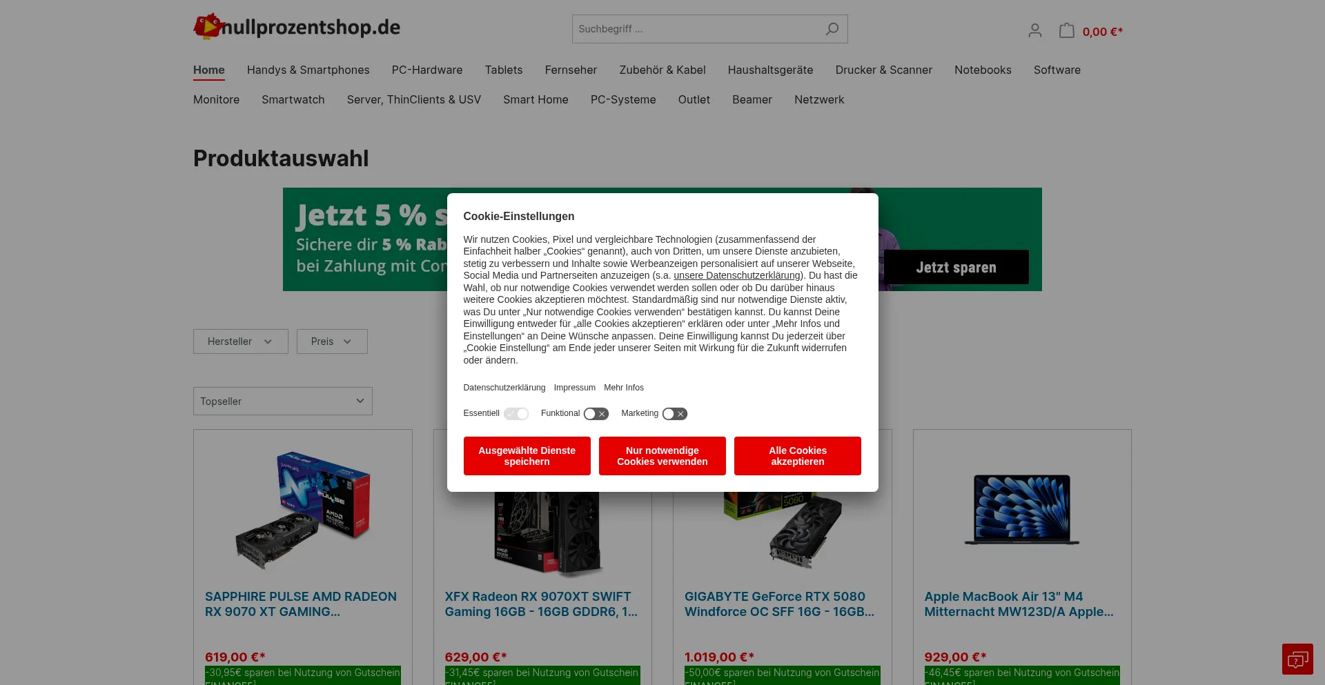 Analysis indicates that nullprozentshop.de operates as an e-commerce platform facilitating online transactions for goods or services. The website implements shopping cart functionality, payment processing systems, and product catalog features typical of commercial retail operations.