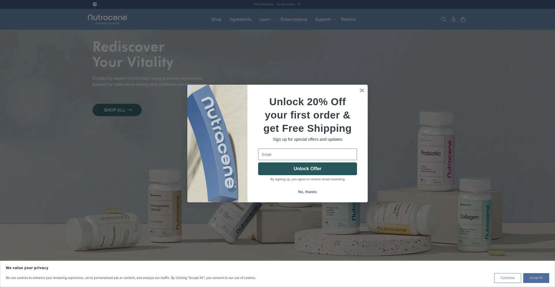 The website implements cookie consent mechanisms in compliance with privacy regulations such as GDPR or CCPA. This demonstrates that nutracene.co.uk adheres to data protection standards and provides users with control over personal data collection practices.