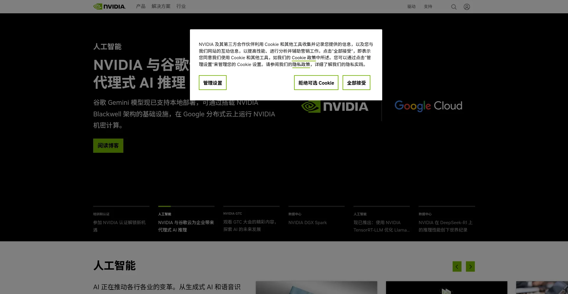 The website implements cookie consent mechanisms in compliance with privacy regulations such as GDPR or CCPA. This demonstrates that nvidia.cn adheres to data protection standards and provides users with control over personal data collection practices.