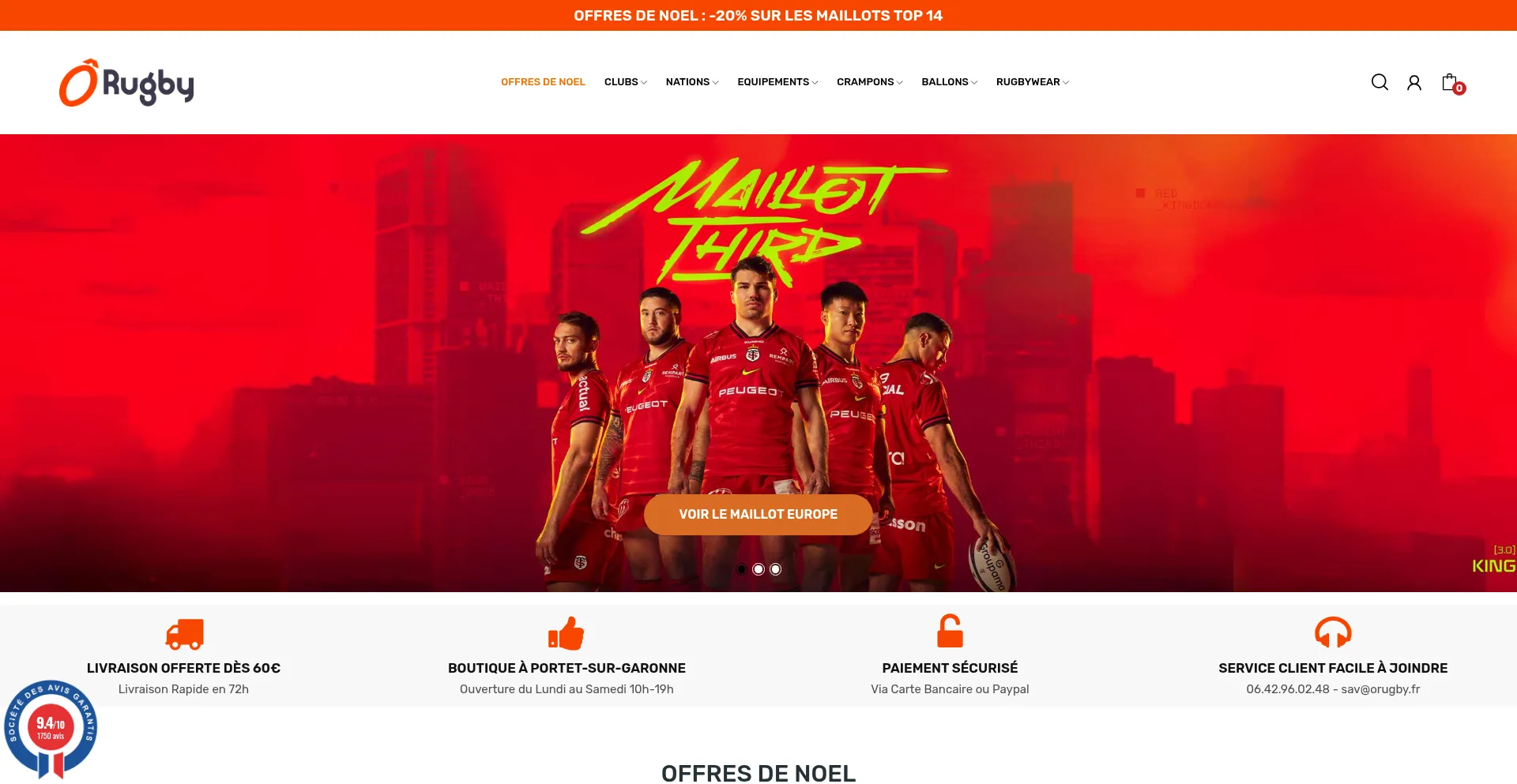Ô Rugby : équipements, maillots clubs TOP 14, équipes de France, crampons, ballons. Livraison offerte dès 60€. Boutique spécialiste rugby à Portet-sur-Garonne.