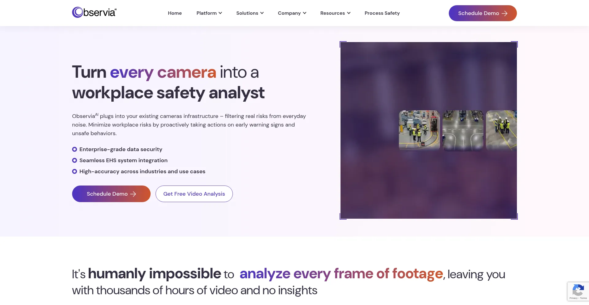 Observia turns your cameras into a 24/7 safety analysts. One platform to spot hazards, minimize liability, take proactive actions and protect your team.