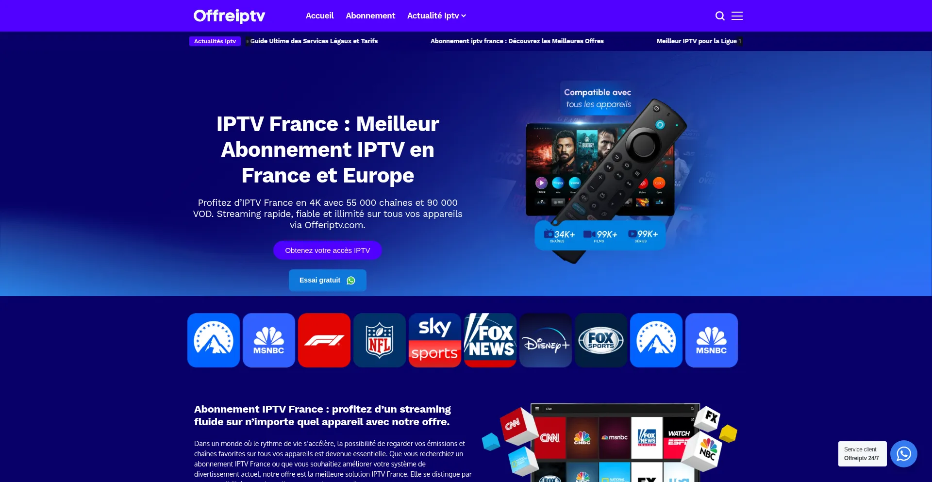 Profitez d’IPTV France en 4K avec 55 000 chaînes et 90 000 VOD. Streaming rapide, fiable et illimité sur tous vos appareils via Offeriptv.com.