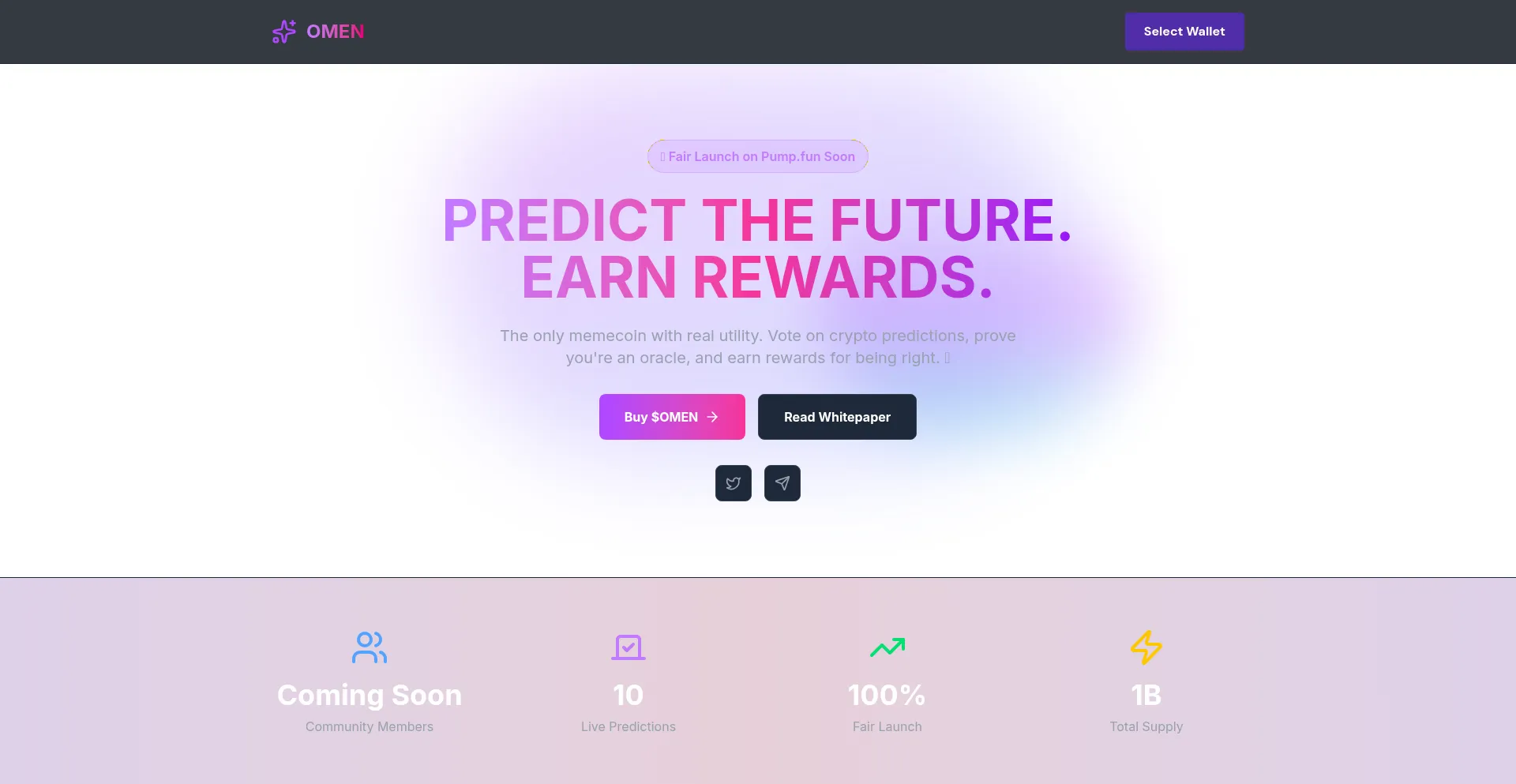 The first memecoin with real utility. Vote on crypto predictions, prove you're an oracle, and earn $OMEN rewards. Fair launch on Pump.fun.