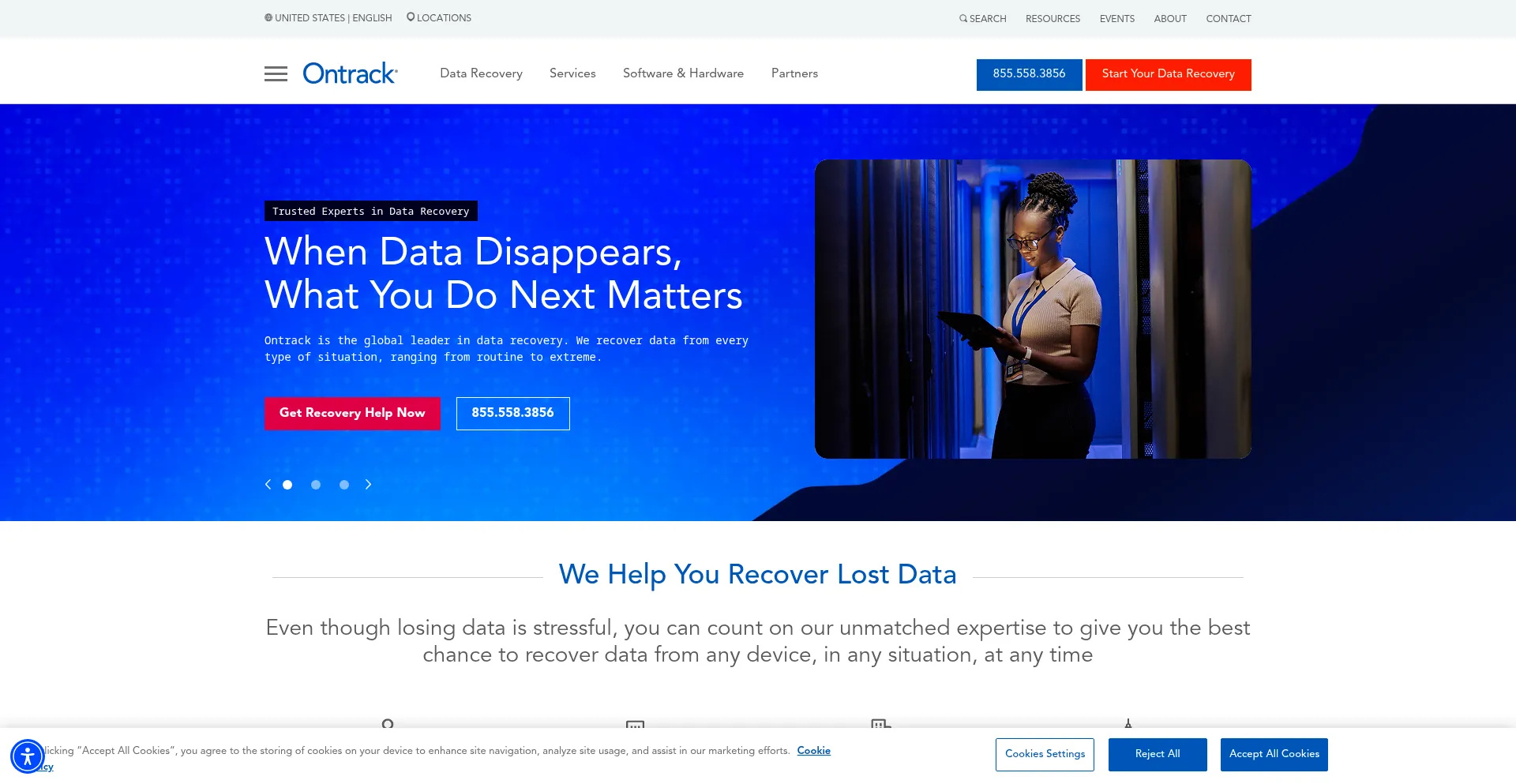 The website implements cookie consent mechanisms in compliance with privacy regulations such as GDPR or CCPA. This demonstrates that ontrack.com adheres to data protection standards and provides users with control over personal data collection practices.