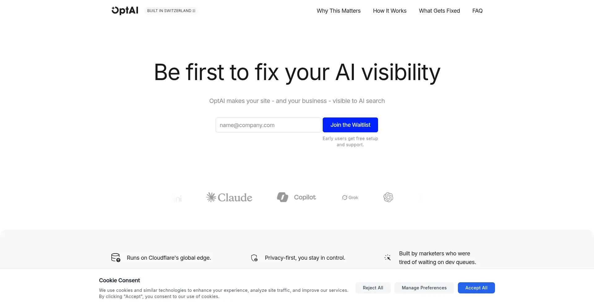 See how visible your site is inside AI answers, then fix it automatically. OptAI adds structured data and Q&A content for you. No developers required.