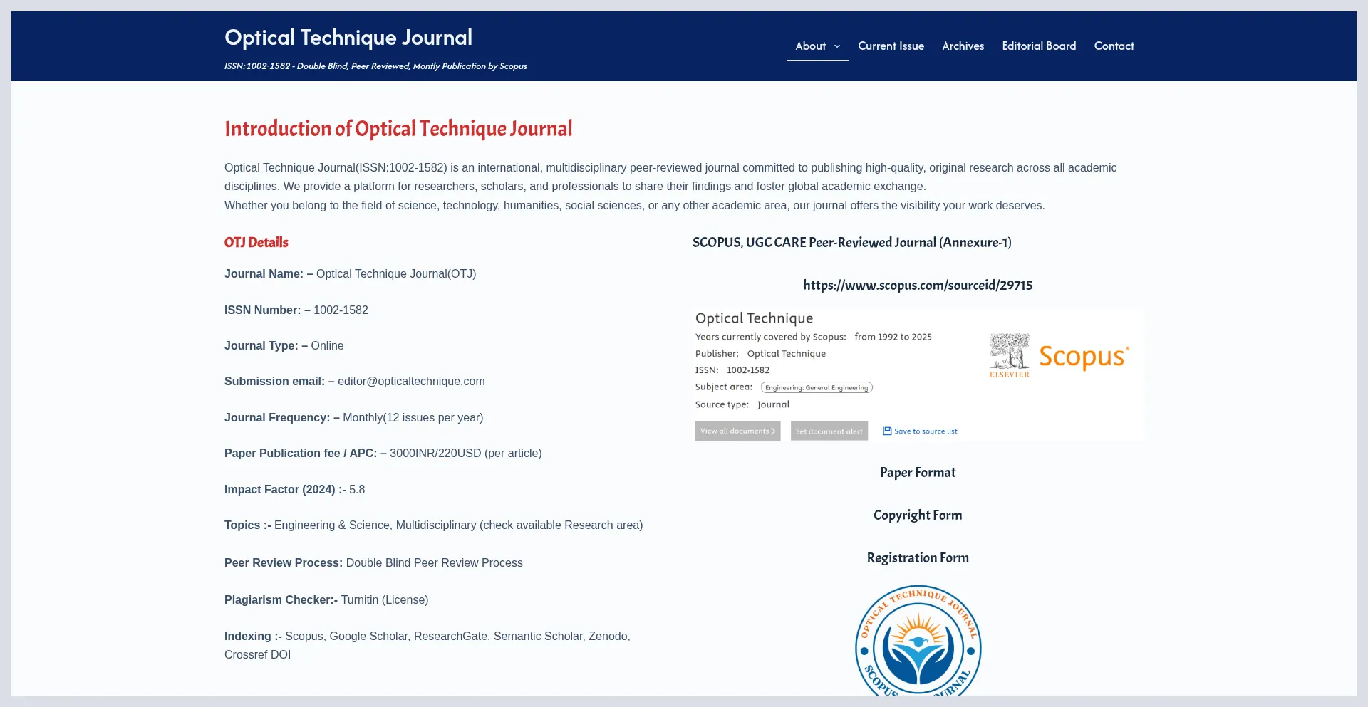 Optical Technique Journal – ISSN:1002-1582 – Double Blind, Peer Reviewed, Montly Publication by Scopus