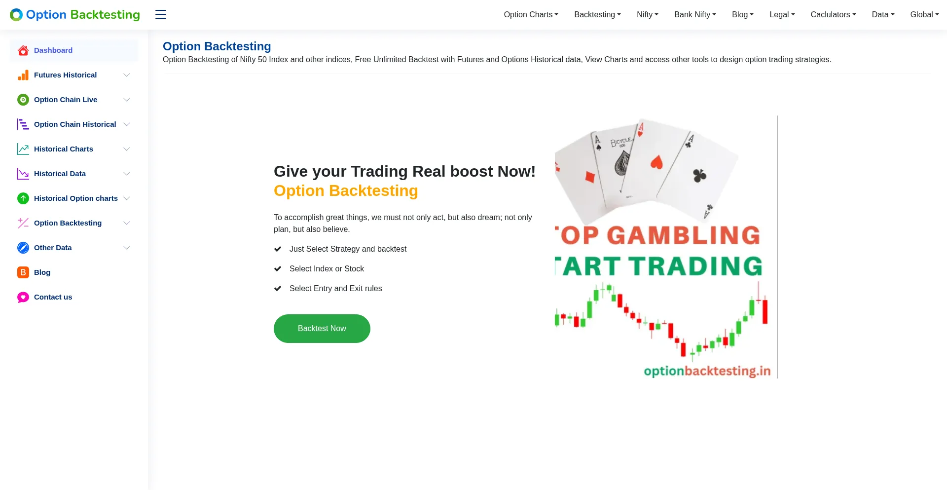 Free Option Backtesting of NIfty 50 Index Options and Futures, Nifty Historical data and Option Charts with replay