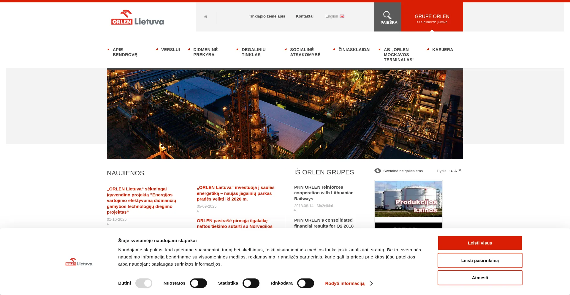 The website implements cookie consent mechanisms in compliance with privacy regulations such as GDPR or CCPA. This demonstrates that orlenlietuva.lt adheres to data protection standards and provides users with control over personal data collection practices.