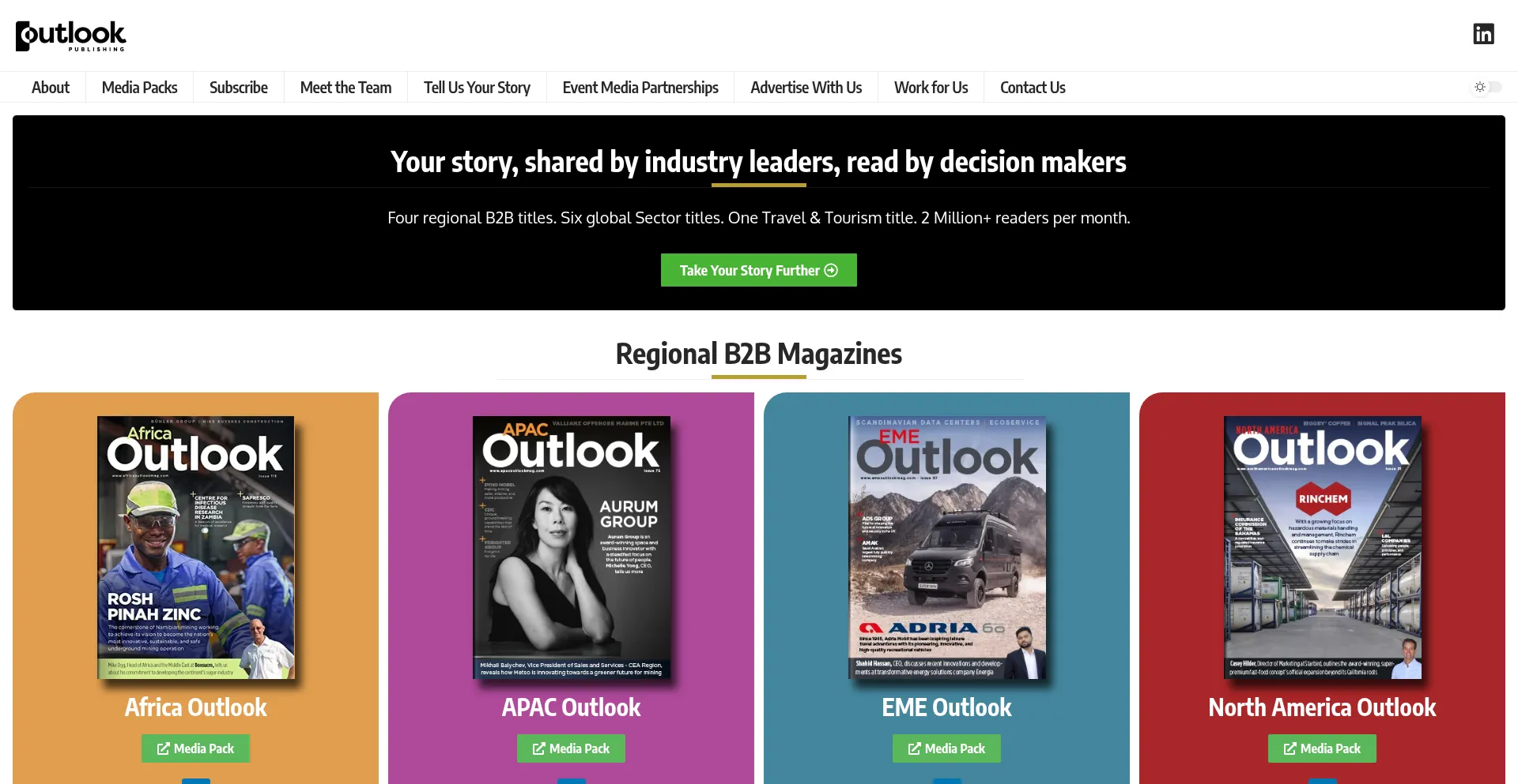 Outlook Publishing is a publisher of global business titles including Africa Outlook, APAC Outlook, EME Outlook, North America Outlook, 6 sector specific titles, and Outlook Tra...