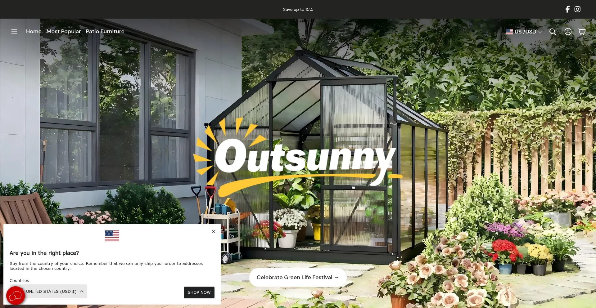 Analysis indicates that outsunny.com operates as an e-commerce platform facilitating online transactions for goods or services. The website implements shopping cart functionality, payment processing systems, and product catalog features typical of commercial retail operations.