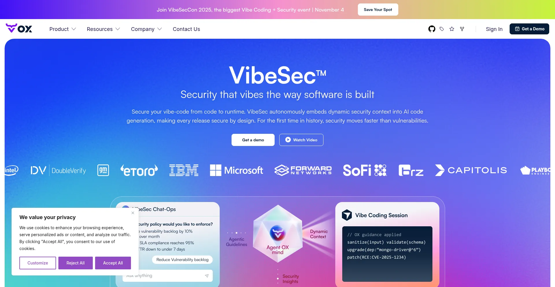 The website implements cookie consent mechanisms in compliance with privacy regulations such as GDPR or CCPA. This demonstrates that ox.security adheres to data protection standards and provides users with control over personal data collection practices.