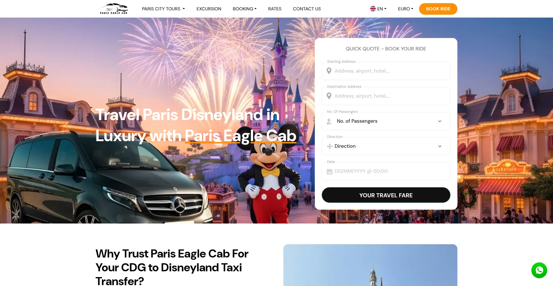 Private Disneyland Paris taxi transfer service from Paris CDG, Orly Airport, Beauvais Airport with Paris Eagle Cab. 24*7 Services, & No upfront payment.