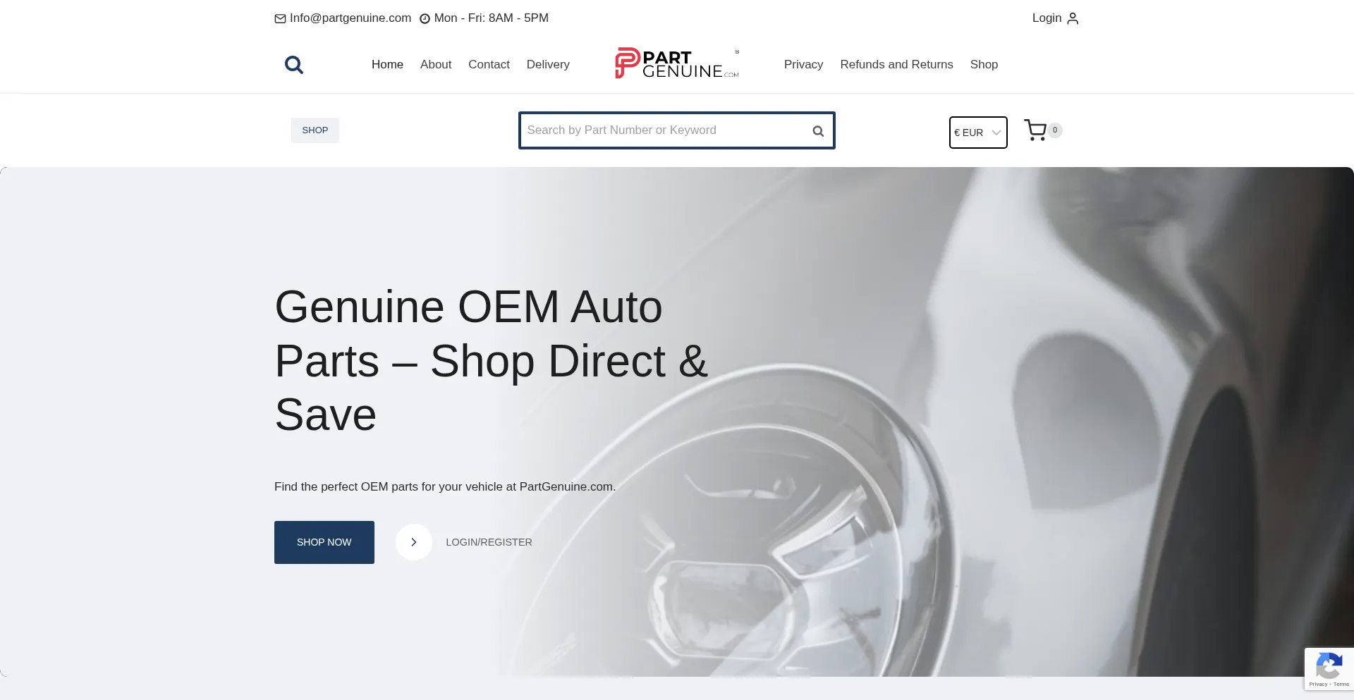 Analysis indicates that partgenuine.com operates as an e-commerce platform facilitating online transactions for goods or services. The website implements shopping cart functionality, payment processing systems, and product catalog features typical of commercial retail operations.
