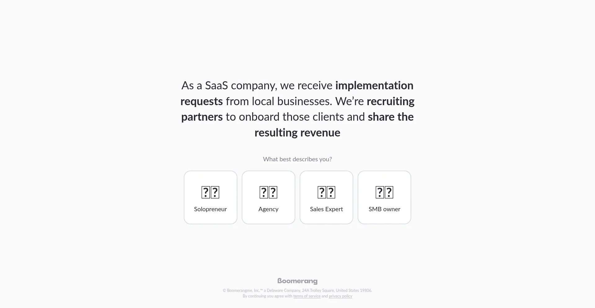 The partners.boomerangme.com website implements data collection forms requesting personal information including names, email addresses, phone numbers, or other sensitive details. Users should verify the legitimacy of it and review privacy policies before submitting personal data.