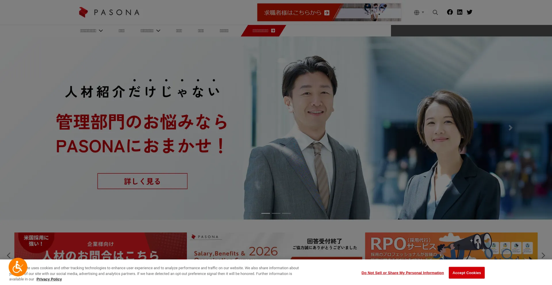 The website implements cookie consent mechanisms in compliance with privacy regulations such as GDPR or CCPA. This demonstrates that pasona.com adheres to data protection standards and provides users with control over personal data collection practices.