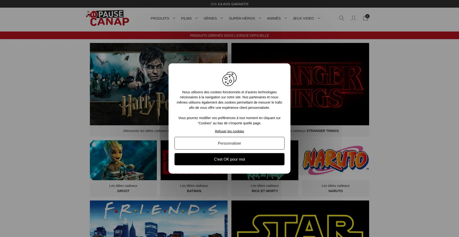 Pause Canap est spécialisé dans la vente de produits dérivés de films, dessins animés et séries tv. T-shirt, peignoirs, casquettes, mugs, porte-clés, ...