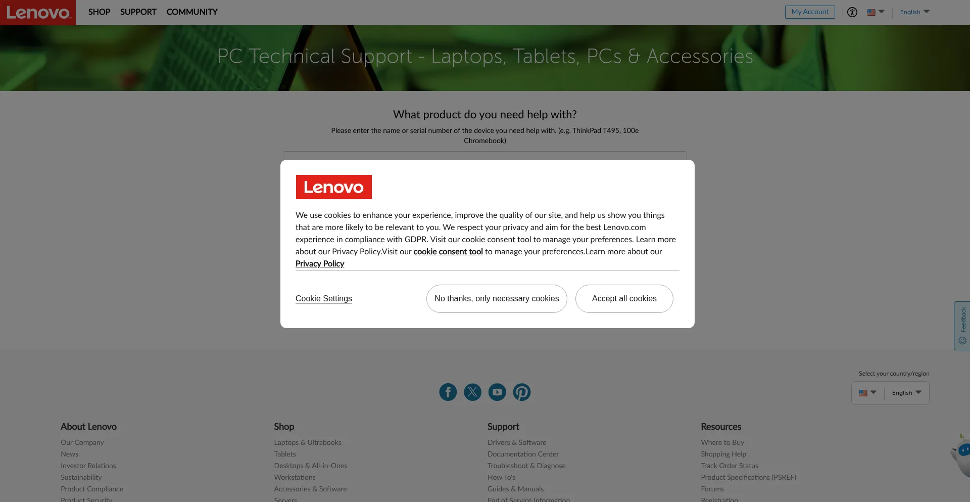 The website implements cookie consent mechanisms in compliance with privacy regulations such as GDPR or CCPA. This demonstrates that pcsupport.lenovo.com adheres to data protection standards and provides users with control over personal data collection practices.