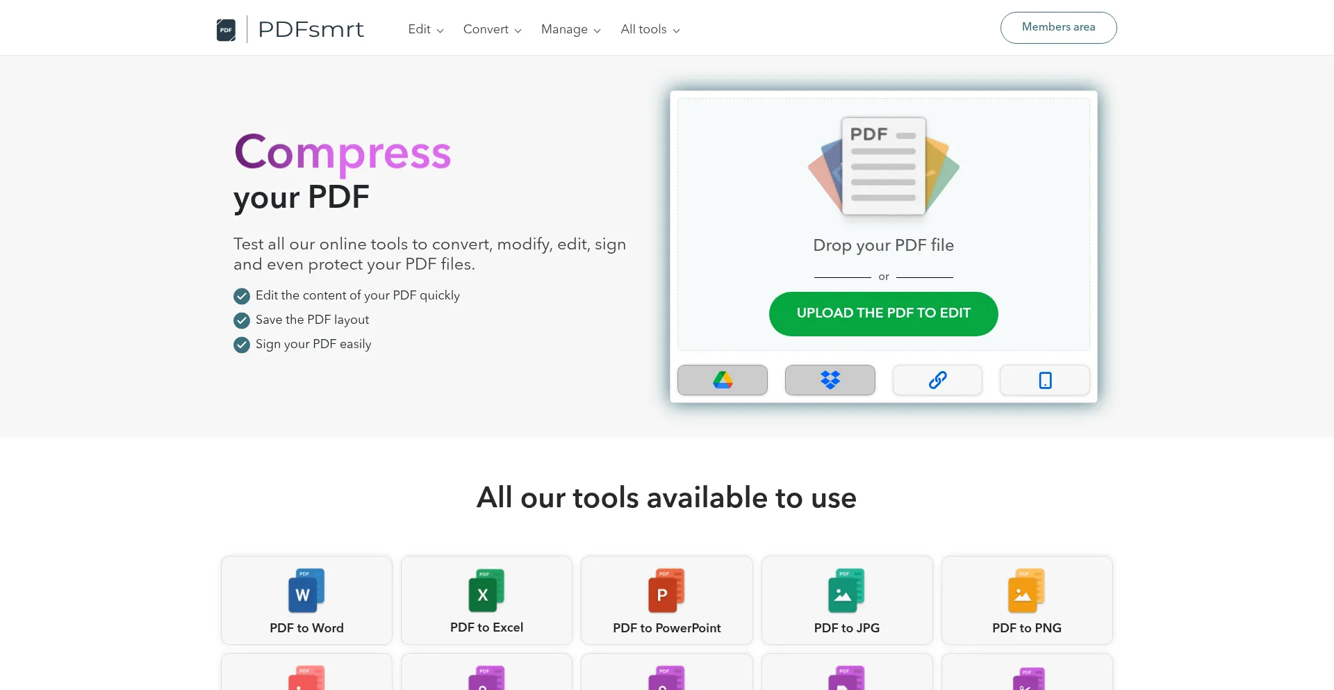 Find out about our tools for converting PDFs (to Word, PPT, JPG, etc.), modifying PDF files, signing PDFs and compressing your documents online.