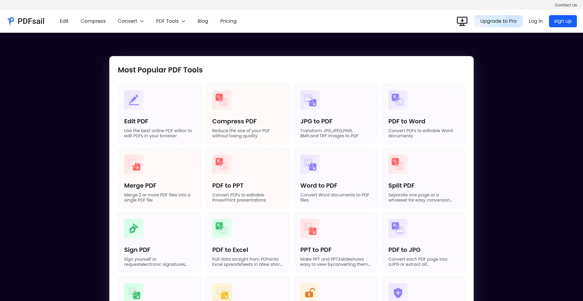 PDFsail offers free online PDF tools for editing, converting, merging, compressing, and OCR. No download required. Try this AI-powered all-in-one PDF solution now!