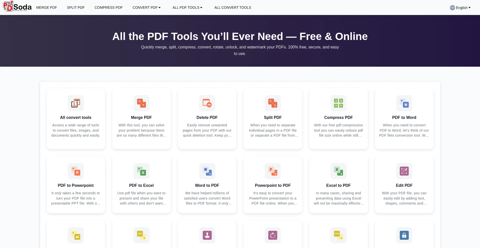 Work with your PDF files easily using PdfSoda — the free online toolkit to merge, split, compress, convert, and edit PDFs in seconds.